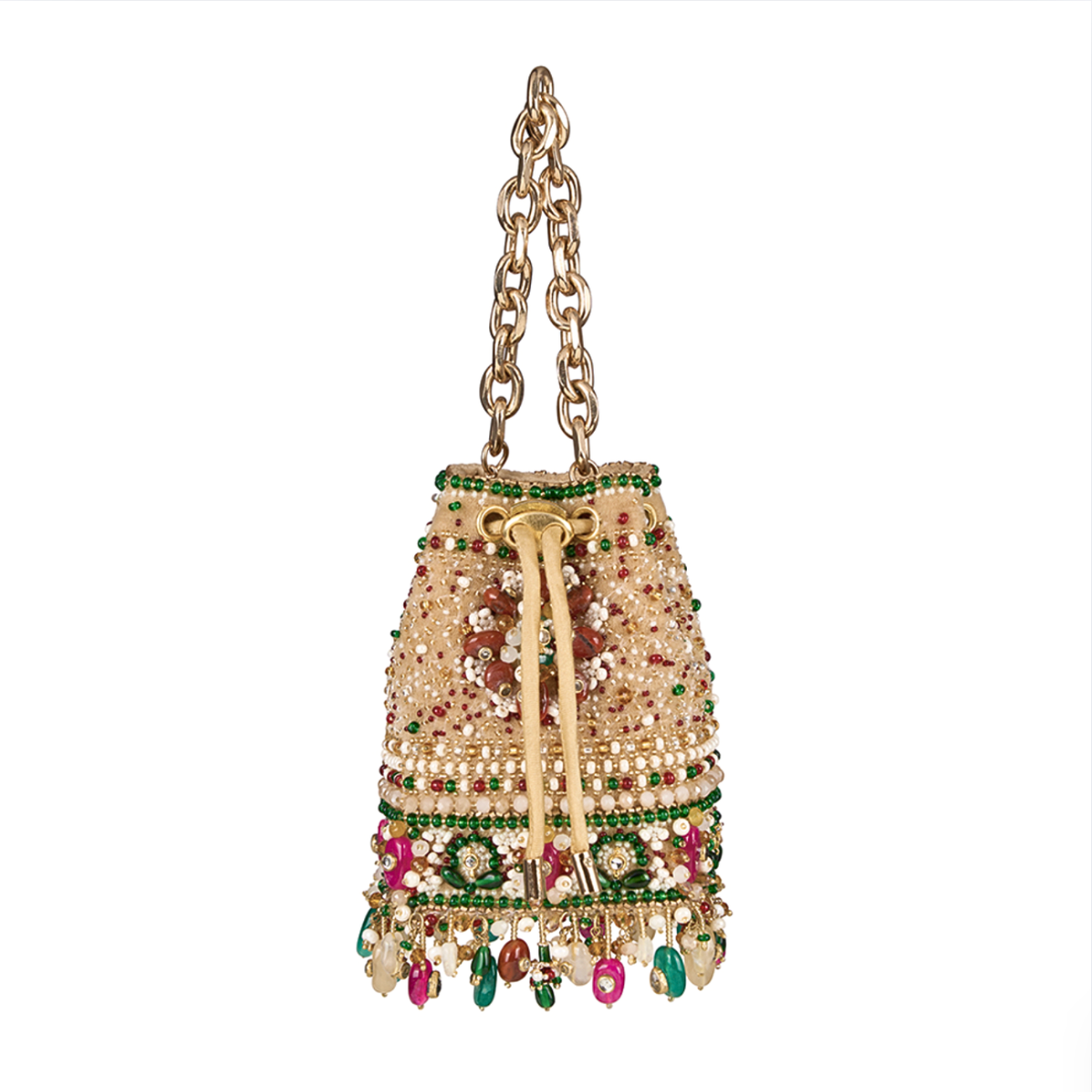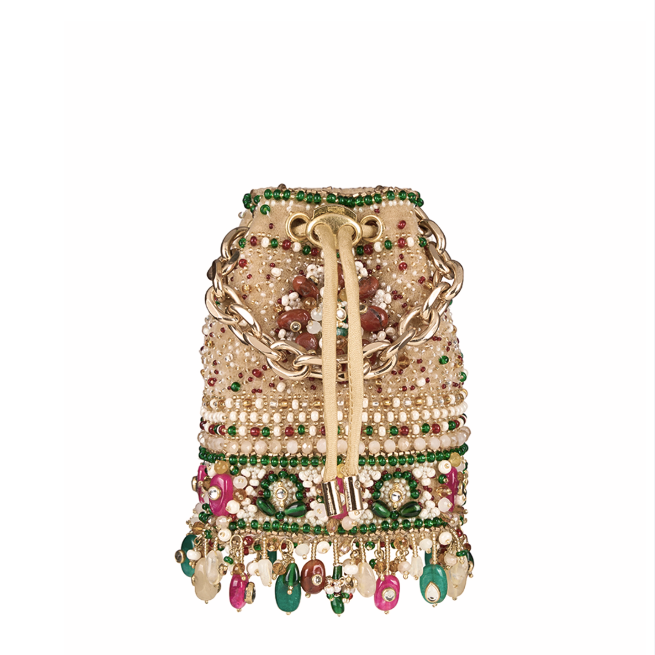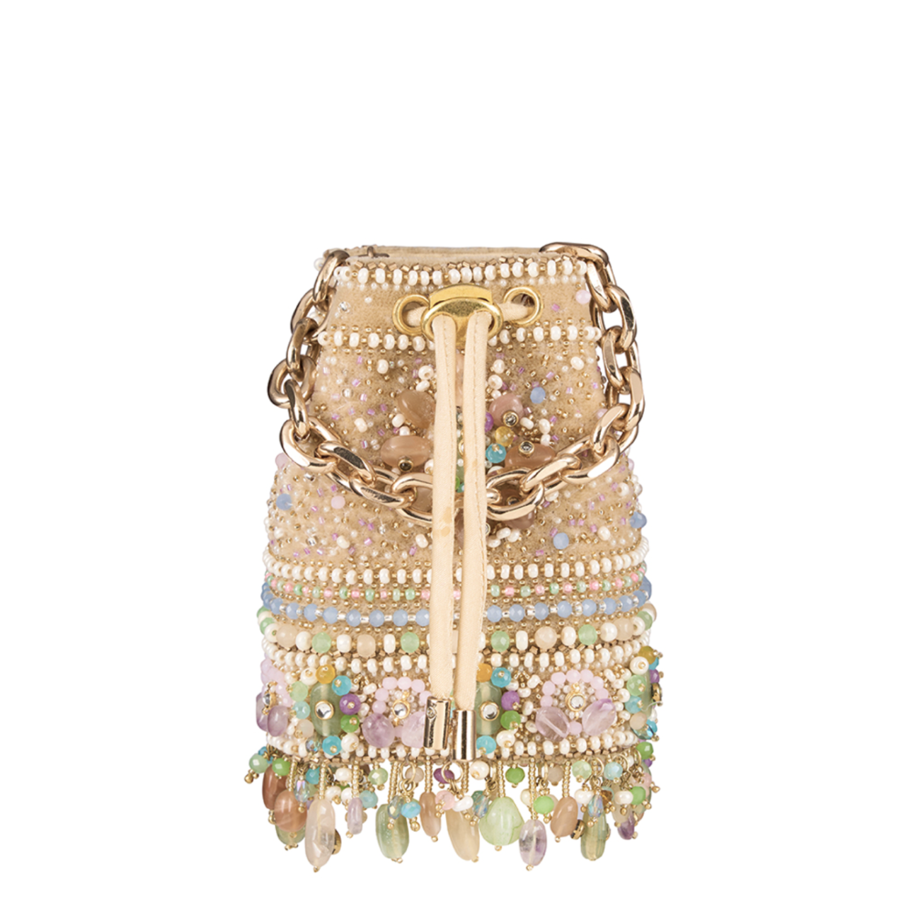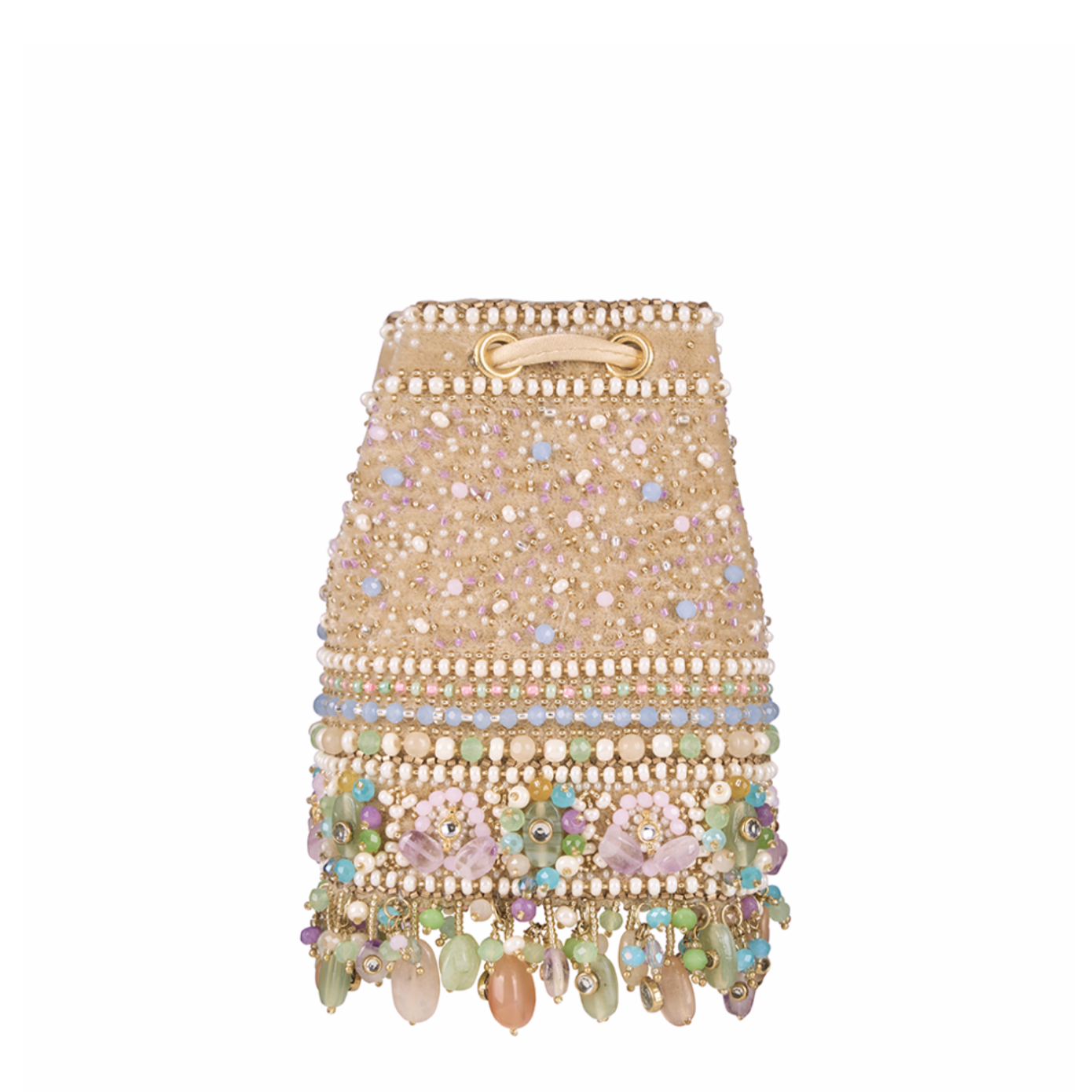 Inspired by opulent encrusted legacy Jadau and Polki jewellery, the Amara Micro Potli Amethyst Lavender Multi Hued is embellished with semi-precious quartz, stones, kundans and lustrous gold silver Japanese beads. It is finished with delicate asymmetrical handmade tassels at the bottom. This collectible statement accessory fits in your valuables like a makeup, keys, currency and cards.