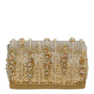 The Nora Flapover Clutch Gold Silver Multi Hued features an assortment of gold, silver & quartz hued semi precious stones & nuggets, iridescent crystals & cultured pearls arranged in an abstract form over a glamorous metallic ombre gold and silver Japanese beads base. This collectible statement accessory fits in your valuables like a smartphone, makeup, keys, currency and cards.