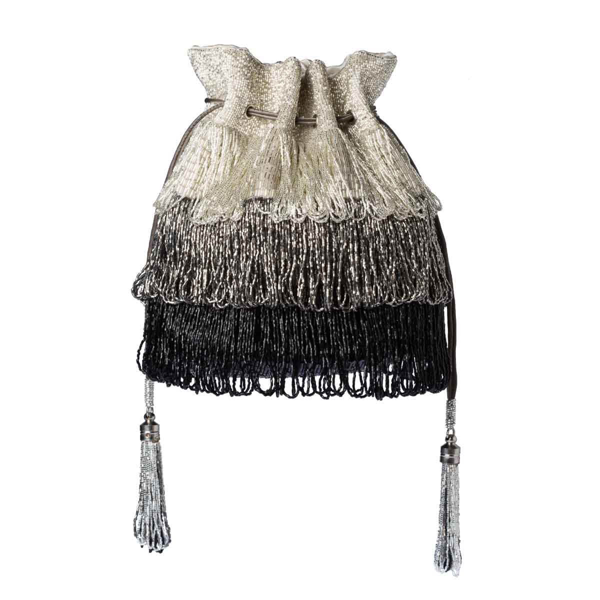 Delicate Japanese glass beads hand embroidered pouch with wristlet and chain handle.