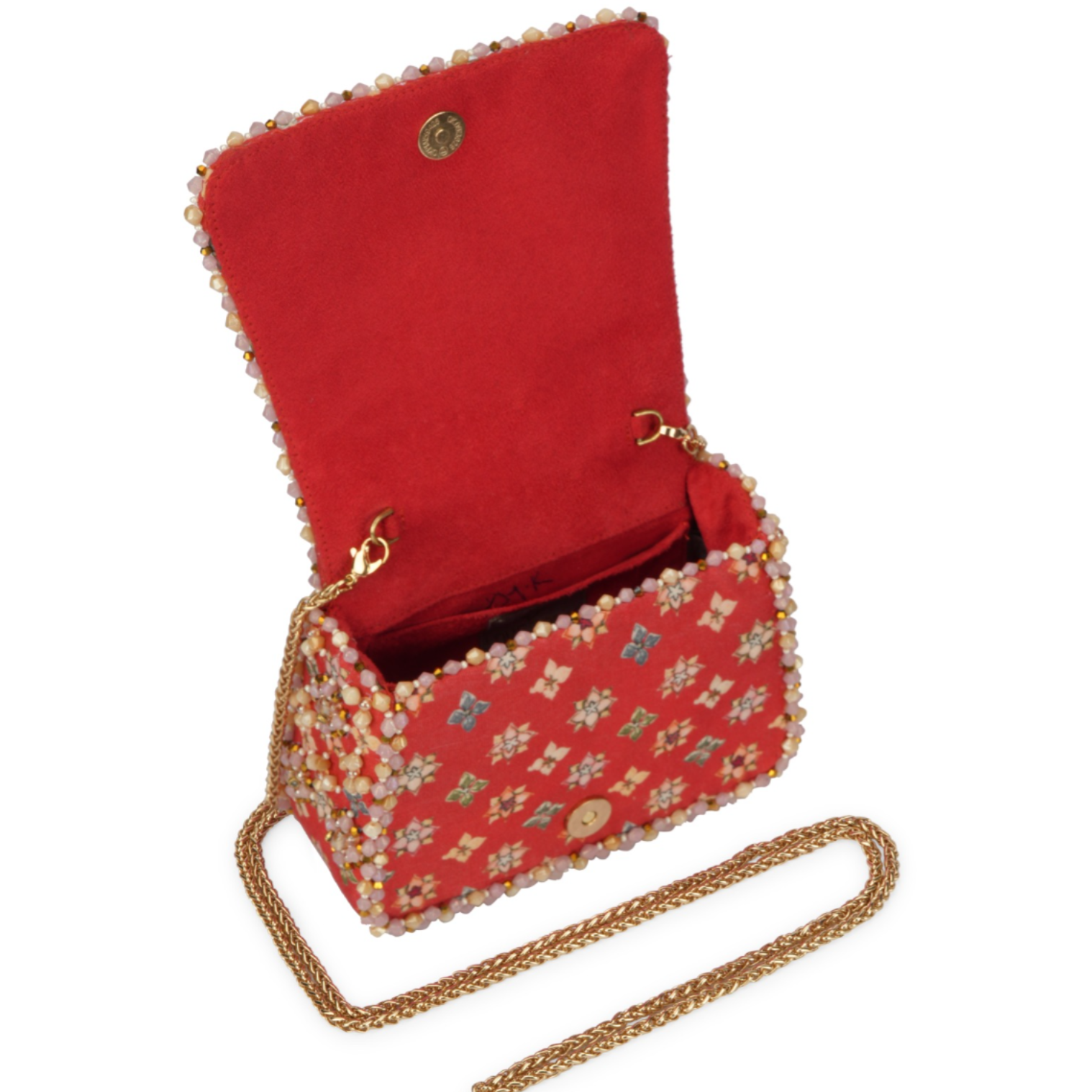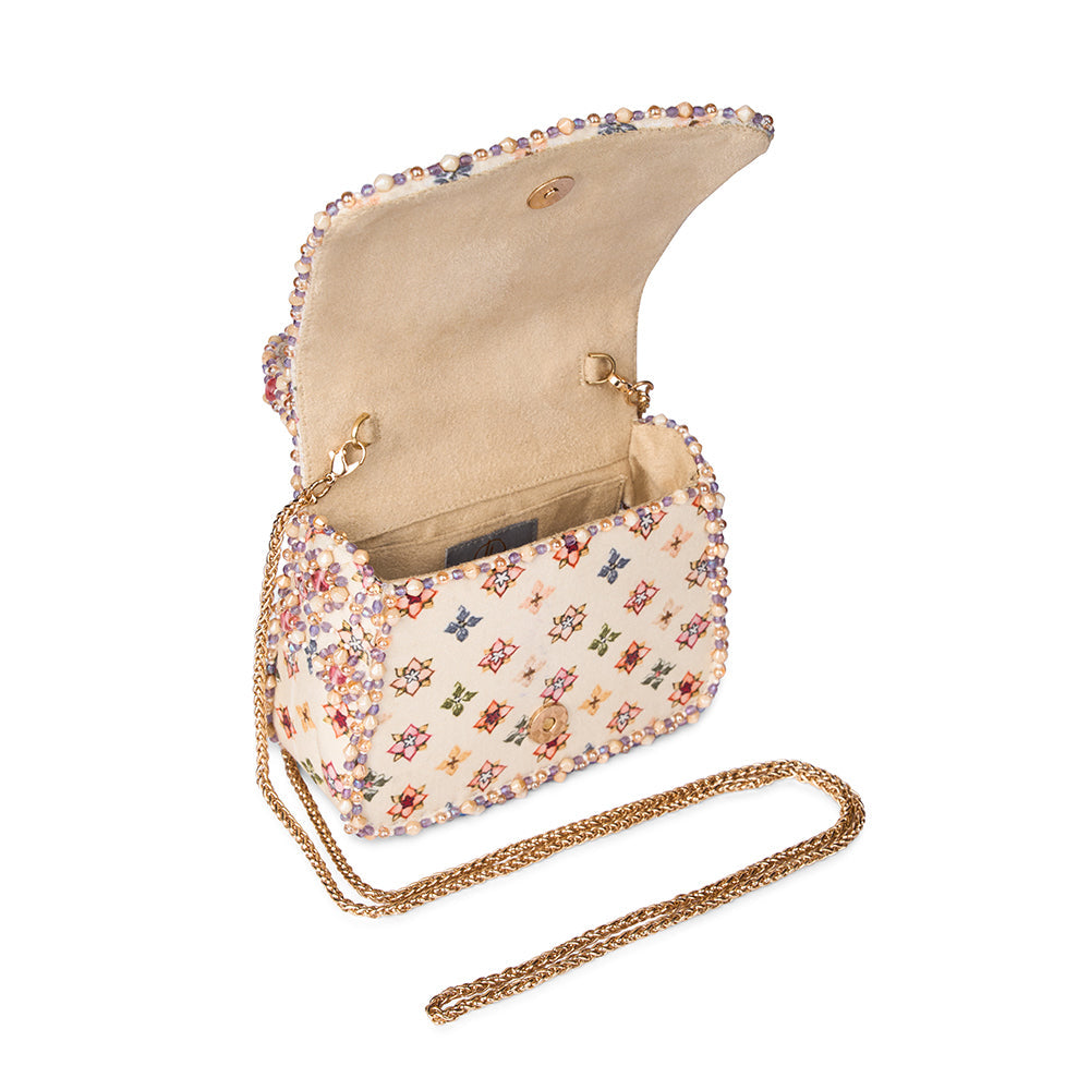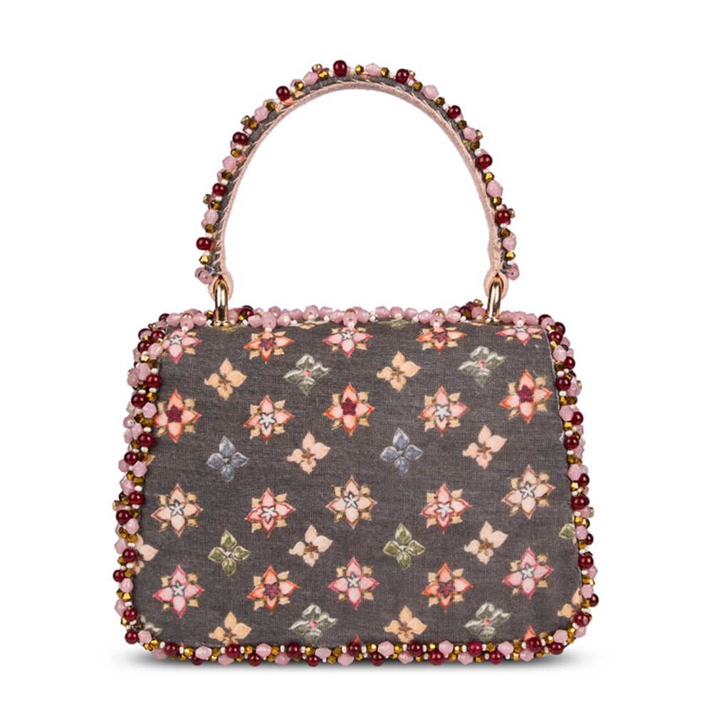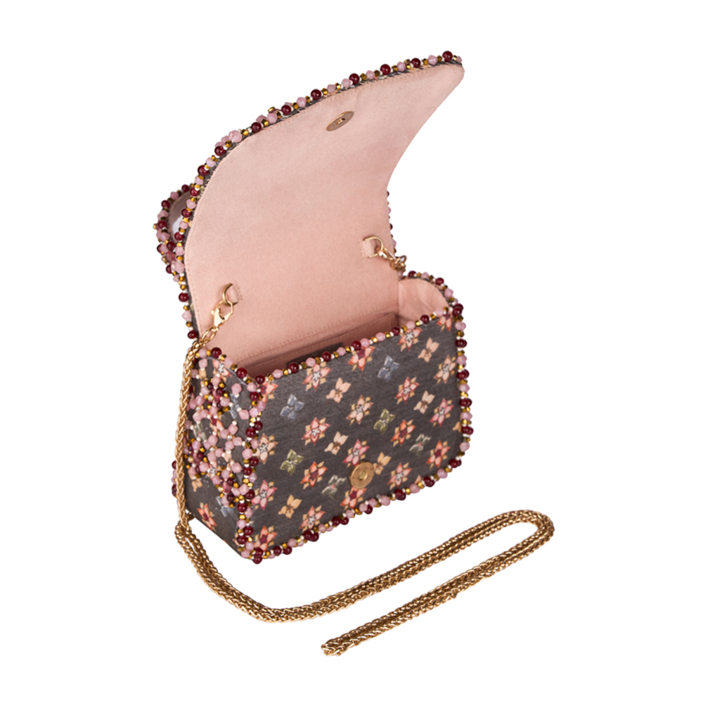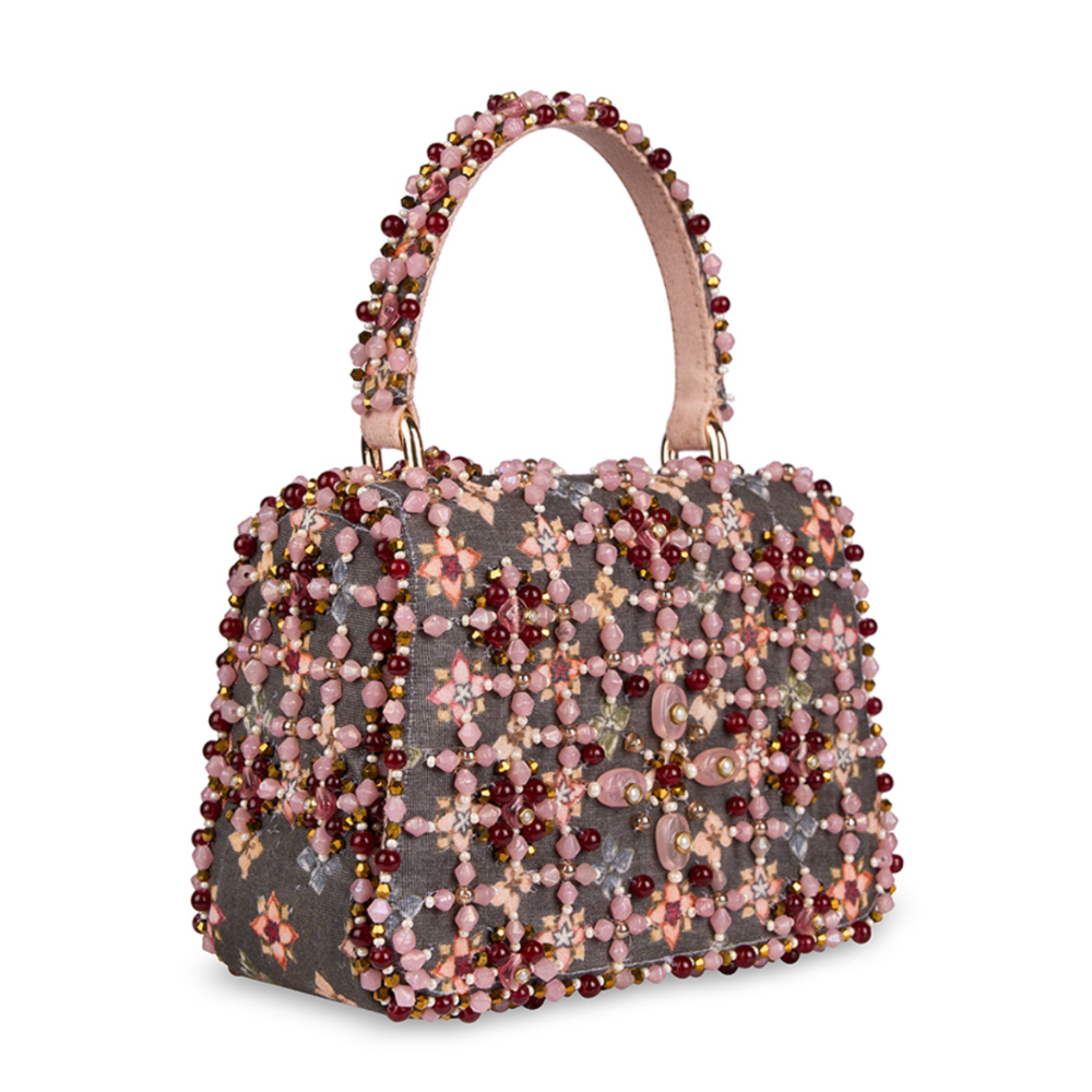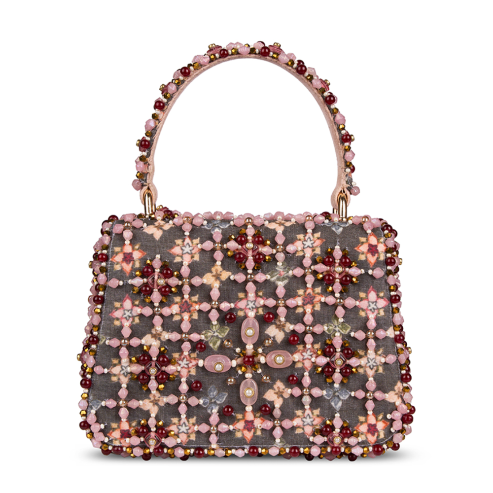 The Kamya Mini Trapezium Carnelian Red Multi Mosaic Bloom is a joyful ode to craftsmanship and colour. It is adorned with a lattice of floral motifsÑeach meticulously embroidered using Japanese seed beads, crystals, pearls, and semi-precious stones in a medley of rose, lilac, blush, and coral tones. Its sculpted trapezium silhouette is framed by an intricately embellished handle and a beaded edge, offering a jewel-like finish. A perfect harmony of structure and sparkle, this mini bag is ideal for festive occasions, intimate gatherings, and elegant soirŽes. A true statement piece, it holds your essentials & cards, keys, makeup, and moreÑwith graceful charm.