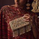This eclectic Flapover clutch is sumptuously hand embroidered with luminous Japanese micro beads, glass crystals & baroque pearls. Inspired by heritage Kashmiri kanikar shawls, Indian North Eastern stripe weaves & French pashmina designs, this is a timeless piece . An archival paisley design adorns the front while nonchalant embellished stripes dress the back. It has handmade zardosi striped tassels, a suedette lining & long detachable chain handle.
