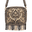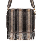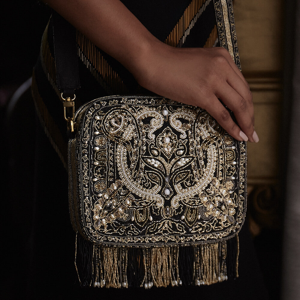 This eclectic messenger cross body bag is sumptuously hand embroidered with luminous Japanese micro beads, glass crystals & baroque pearls. Inspired by heritage Kashmiri kanikar shawls, Indian North Eastern stripe weaves & French pashmina designs, this is a timeless piece . This pouch can be used from both sides, as an archival paisley design adorns the front while nonchalant embellished stripes dress the back. It has handmade zardosi striped tassels.