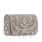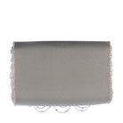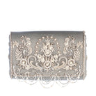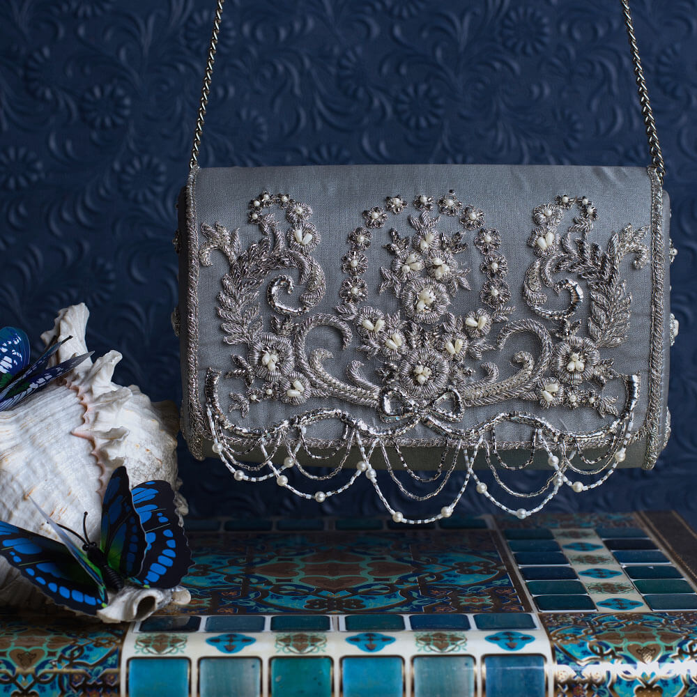 Inspired by the opulence of the golden period in French history called La Belle Epoque, this flapover clutch is intricately hand embroidered with sublime bugle beads,cultured drop pearls and fine gold and silver threads. It has handcrafted chandelier like tassels , a suedette lining and a long detachable chain handle.
