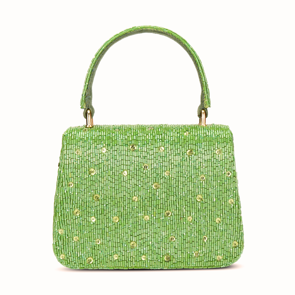 The Eclat Mini Trapezium Jade Green is a neomodern mini bag featuring beautifully hand-embroidered assortment of precision cut Japanese micro beads & crystals in an ombré pattern. It has an ornate yet delicate look. It's compact, structured shape adds a bold, modern edge, while the embellished top handle and a crossbody chain provide versatile styling options. Perfect for holding makeup, currency, cards and keys, and includes an inside slip pocket for easy organization. Perfect for elevating both day and evening looks.