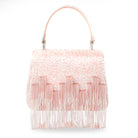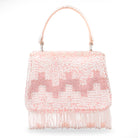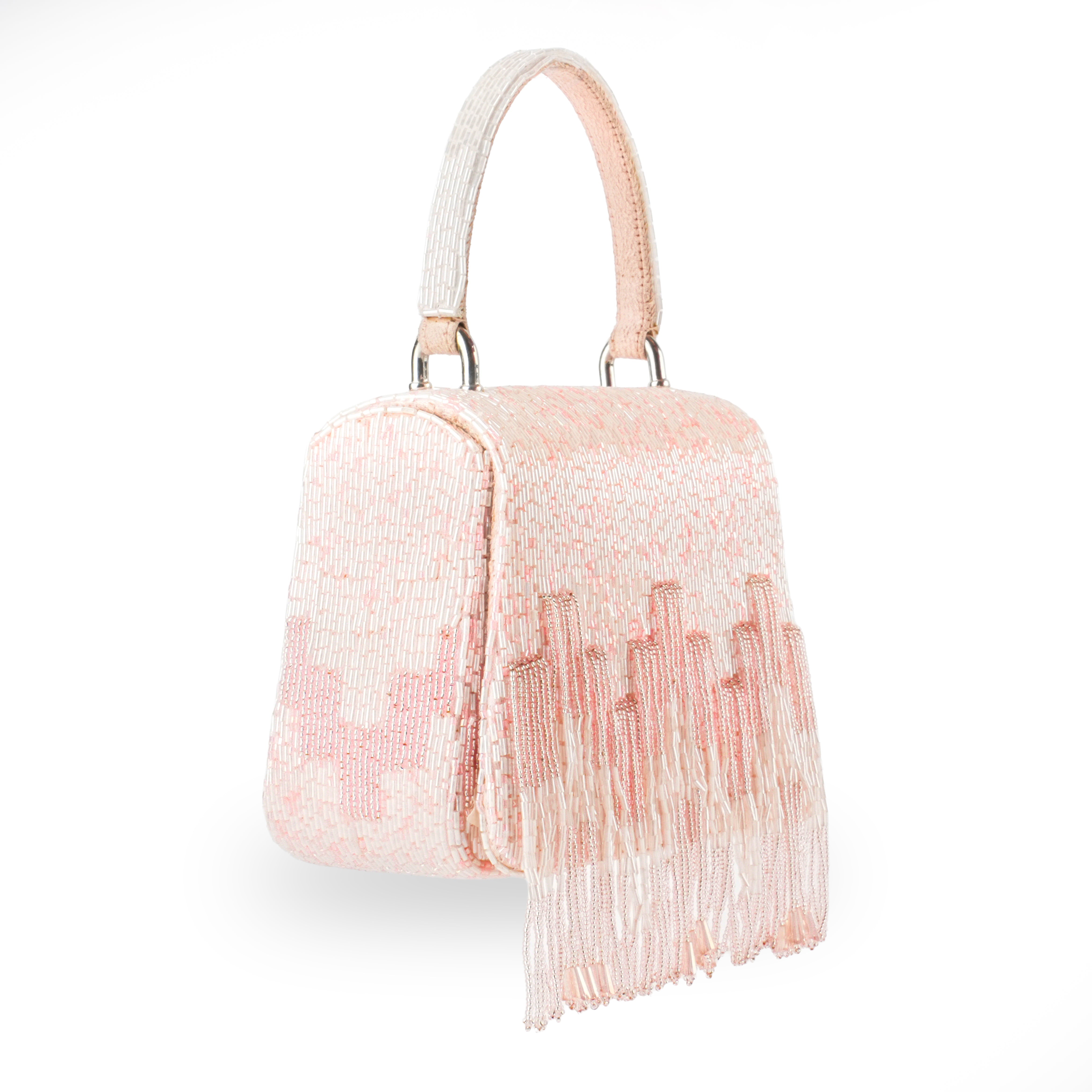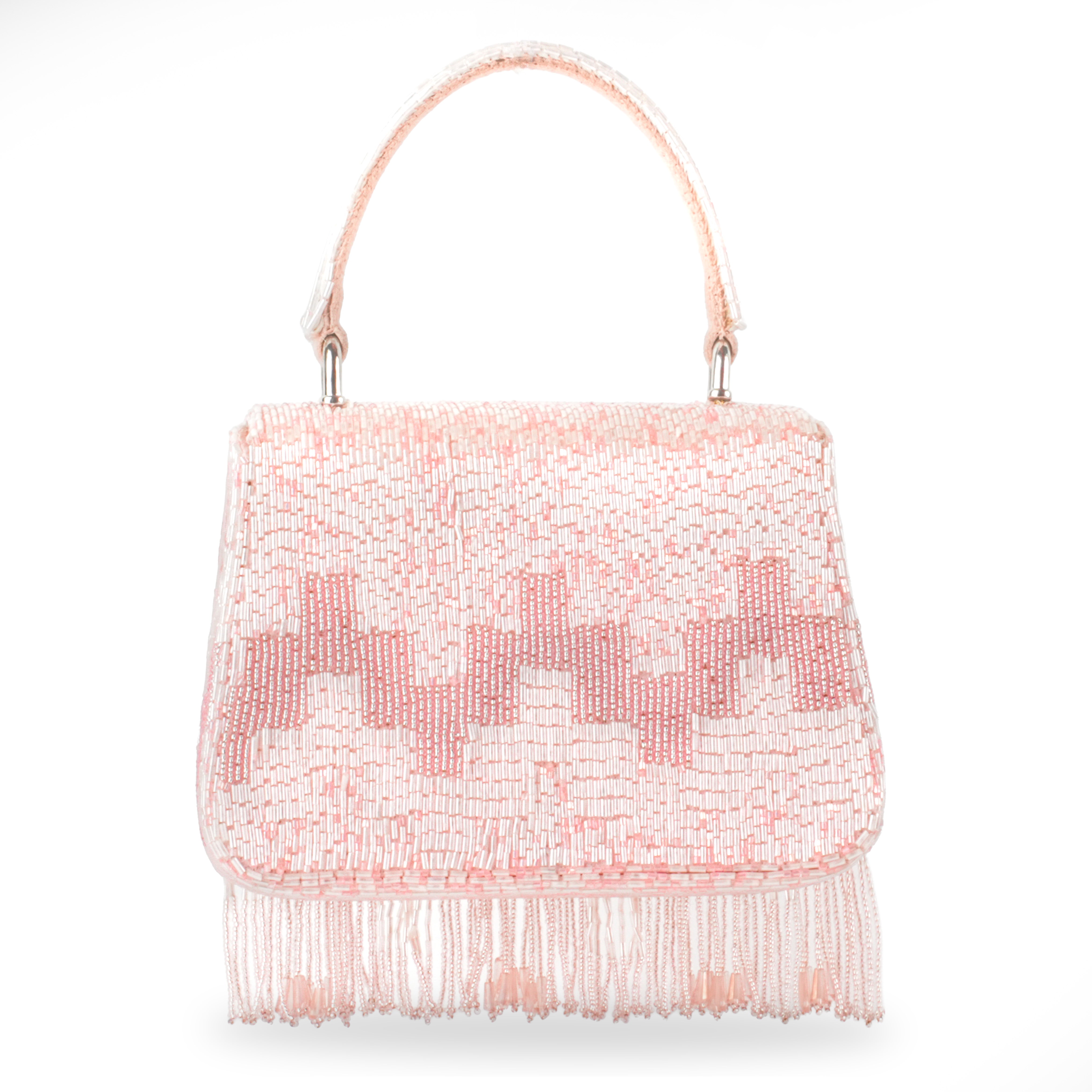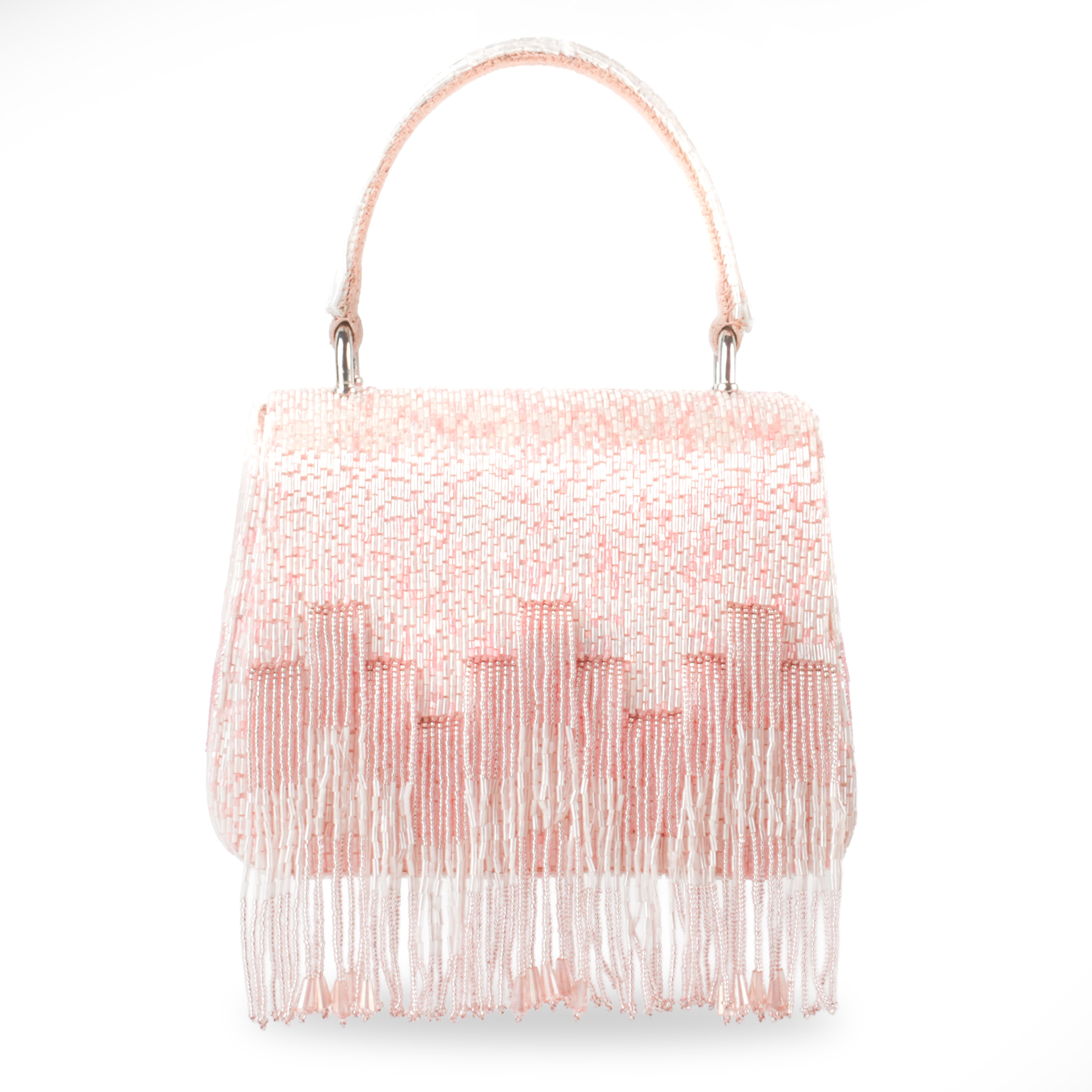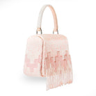 This ritzy Firante Mini Trapezium Rose Quartz Pink is decadently hand embroidered with lustrous tinted crystals & Japanese micro beads. Aztec tassels adorn the fluid mettalic embellishment of the front side whereas a subtle geometric Pattern dresses the reverse side.As the festive season heralds party dressing , the sparkling metallic embellishment of this style is sure to amplify the opulence of any ensemble.