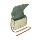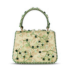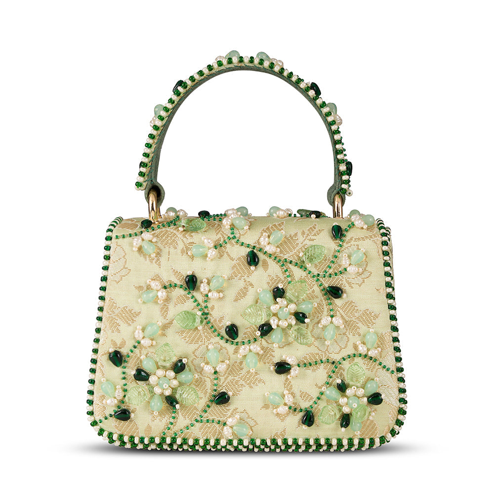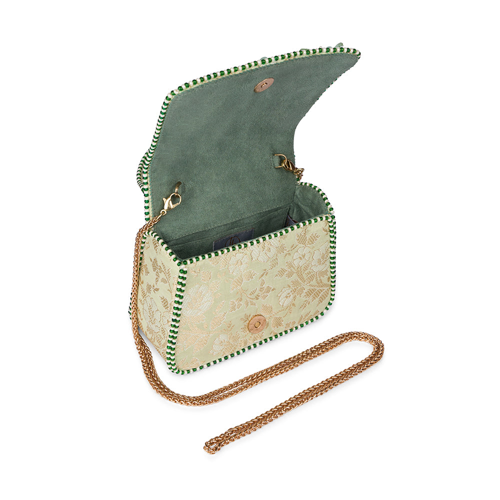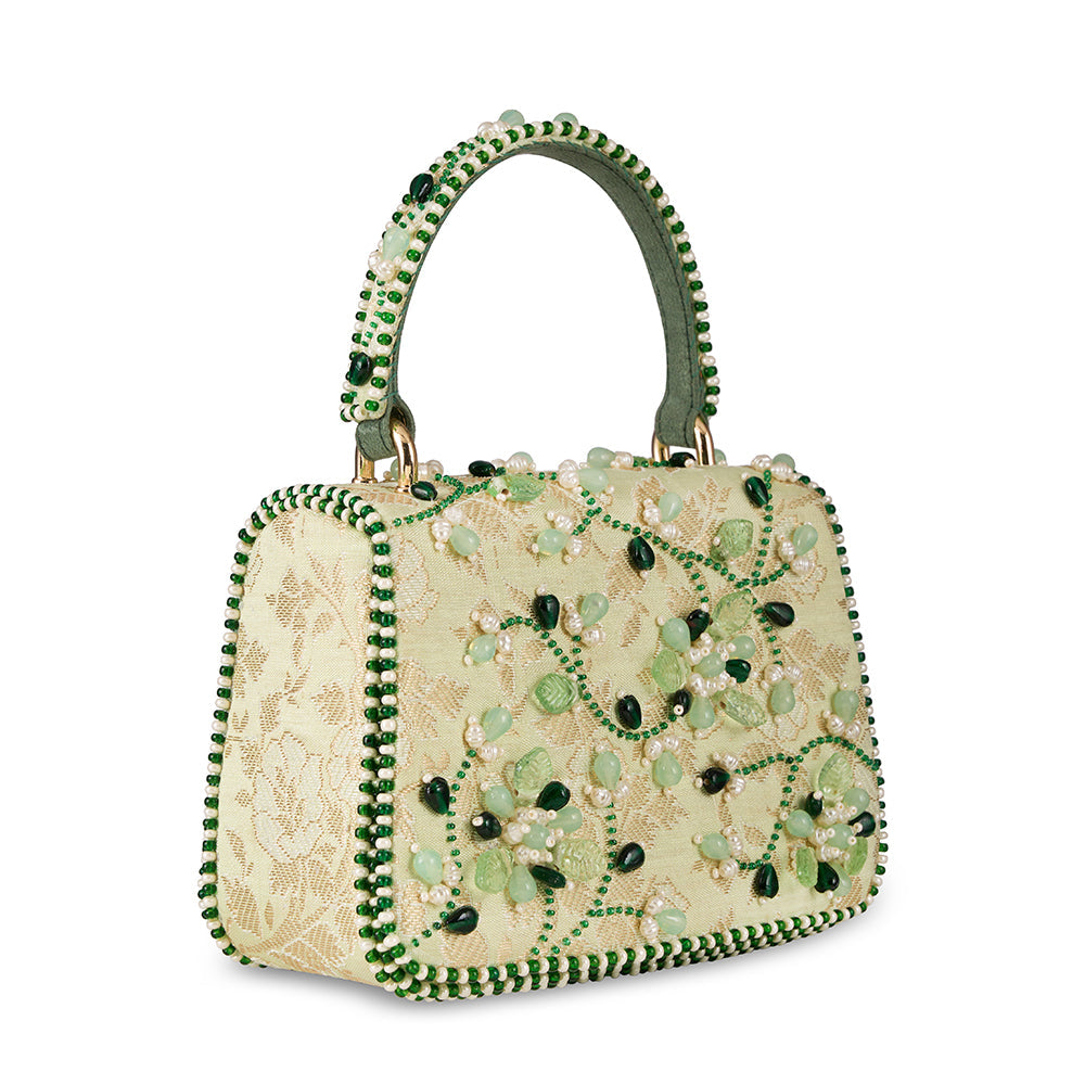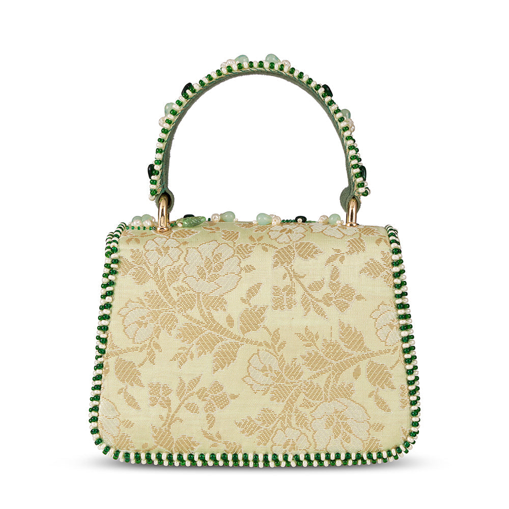 The ISA Mini Trapezium in Topaz Green Bloom is a refined expression of artisanal elegance. Crafted from luminous silk, it features intricate hand-embroidered floral motifs in soft green and ivory, using Japanese seed beads, pearls, glass crystals, and semi-precious stones. Its structured silhouette is framed with a jeweled beaded trim and finished with a beautifully embellished top handle. Delicate zari vines add a touch of timeless botanical charm. Perfect for daytime festivities or elegant soirŽes, it holds your essentials & keys, cards, money, and makeupÑwith effortless grace.