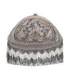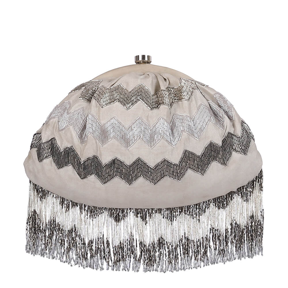 This couture soft pouch is opulently hand embroidered with luminous Japanese micro beads , glass crystals, bullion & silk floss threads. Inspired by the time honoured Palampore chintz & oriental silk carpets from the 'Rug Belt', this is a classic piece . This pouch can be used from both sides - Set in a sublime handbeaded mesh,an artisinal foral motif adorns the front while nonchalant chevron patterns dress the back. It has exquisite zardosi zig zag tassels.